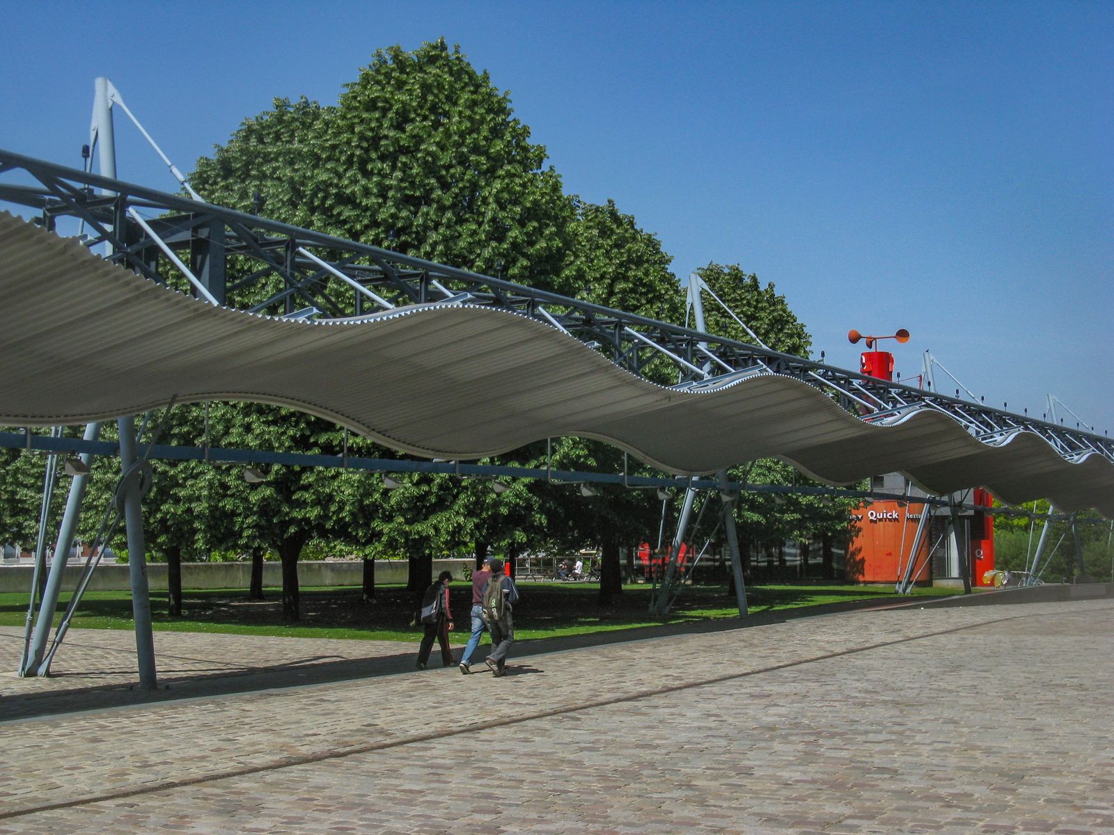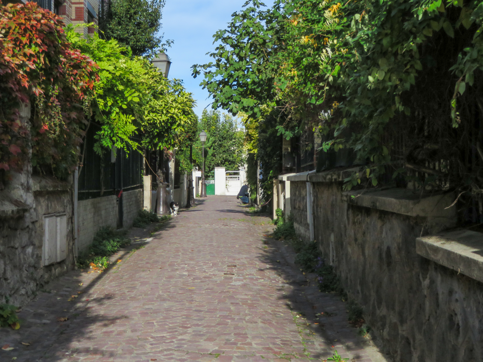 Continuer en face dans l’Allée Darius Milhaud (Ancienne voie ferrée reliant la Petite Ceinture et les Abattoirs de la Villette , Gare ‘Paris Bestiaux’). Prendre le 2e escalier à gauche puis en face la Rue des Carrières d’Amérique et à droite la Villa Manin (Villas du XIXe siècle).
