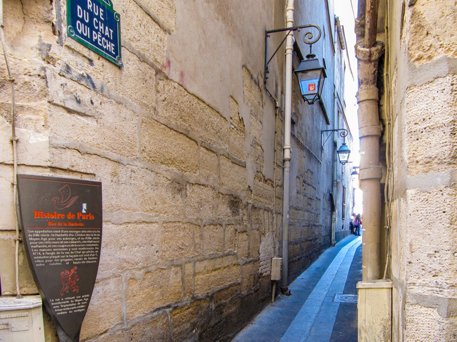 Au 4 , Cartouche « A la Hure d’Or », au 14 , Y d’un mercier. A droite , étroite Rue du Chat qui pêche. Au 57 , Théâtre de la Huchette avec toujours la même pièce de théâtre. Passer devant la Fontaine St Michel (Datant de 1860).