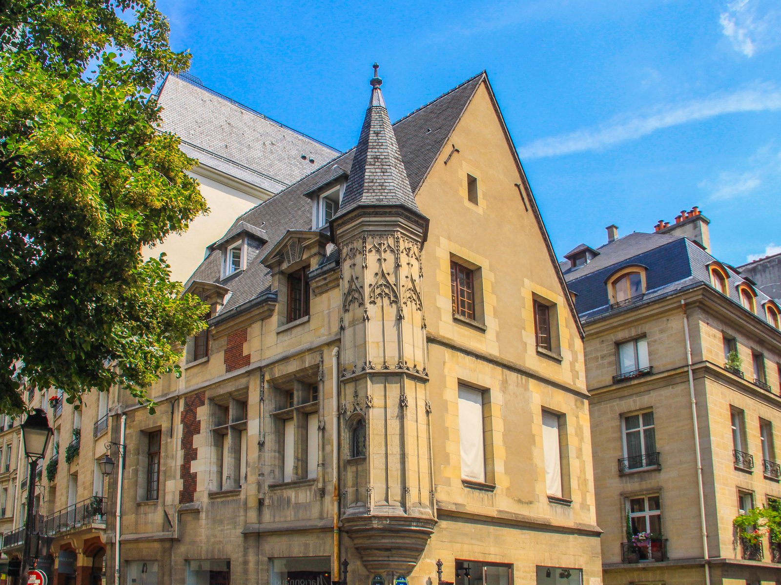 Passer derrière l’Eglise N. D. des Blancs Manteaux. A l’angle , Maison de J. Hérouet (Tourelles datant de Louis XII).