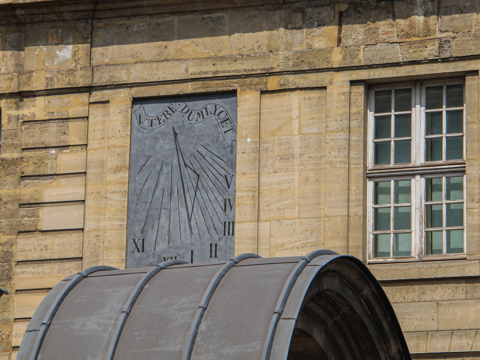 Tourner à droite dans la Rue St Martin puis à gauche dans la Rue Rambuteau, qui longe le Centre Georges Pompidou. Traverser la Rue Beaubourg.  Continuer tout droit dans la Rue Rambuteau puis prendre la Rue du Temple à gauche. Tourner à droite dans la Rue Braque qui arrive en face de la Porte de Clisson. Prendre à droite, la Rue des Archives. Cadran solaire au 45.