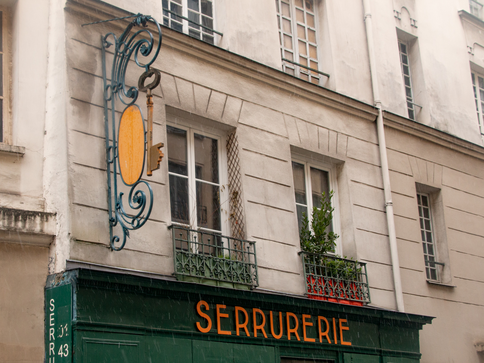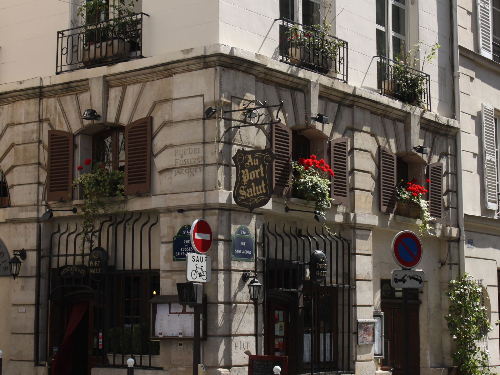 Plus loin, Belles devantures , dont une serrurerie. Continuer en face dans la Rue Fossés St Jacques et devanture de Restaurant).
