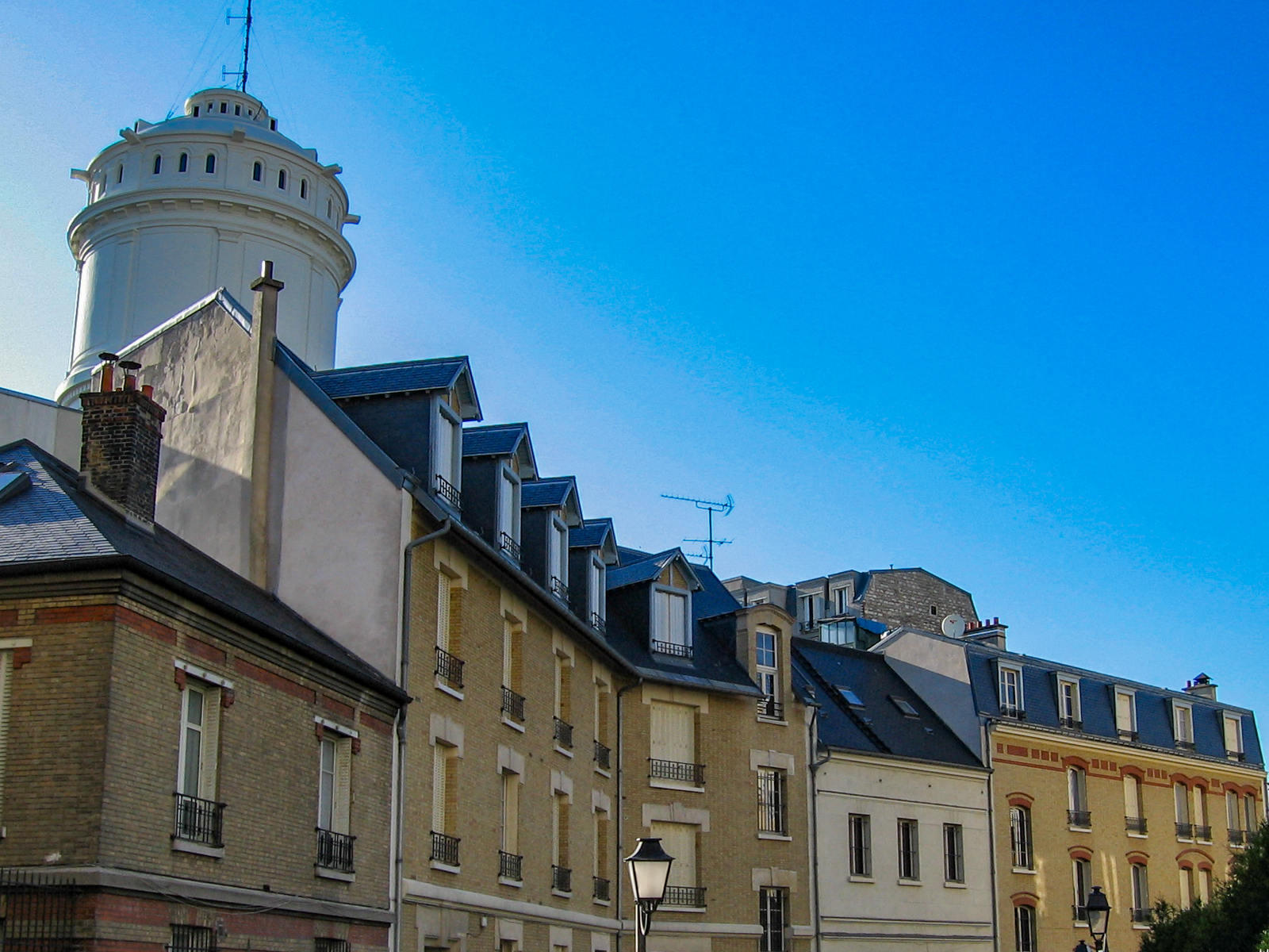Cité du Sacré Coeur. Tourner à droite dans la Rue du Mont Cenis : Vue sur le nord de Paris et le Stade de France. Au carrefour, vieux château d’eau et Tartempion.