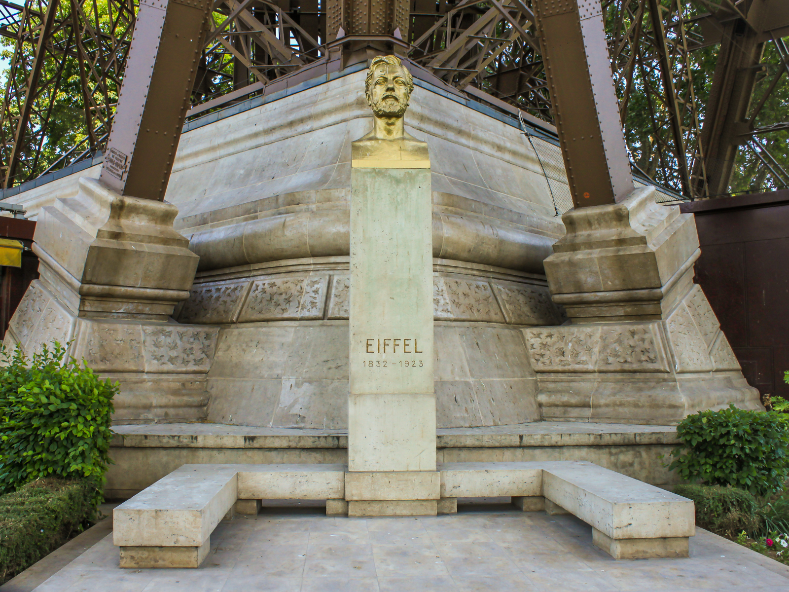 Près du Pilier Nord , Buste de Gustave Eiffel et Ancienne cheminée en brique pour les ascenseurs de l’époque.