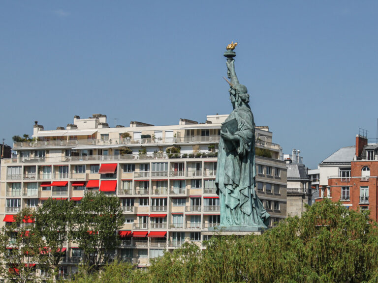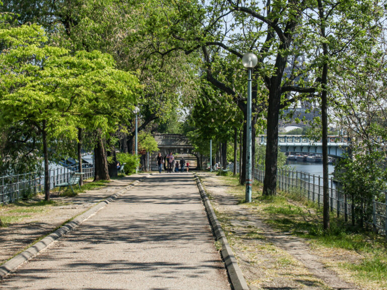 Prendre la Rue Gros à gauche. Traverser la Seine sur le pont de Grenelle et passer à gauche sur l’Allée des cygnes (Digue datant du début du 19e siècle).A droite, petite Statue de la Liberté (offerte en remerciement de la statue faite par Bartholdi à New York).
