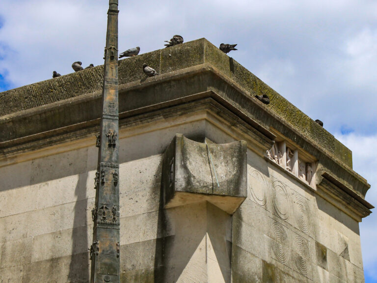 Traverser le Champ de Mars (Fête de la fédération le 14 Juillet 1790). Petit cadran sur un petit monument en pierre.