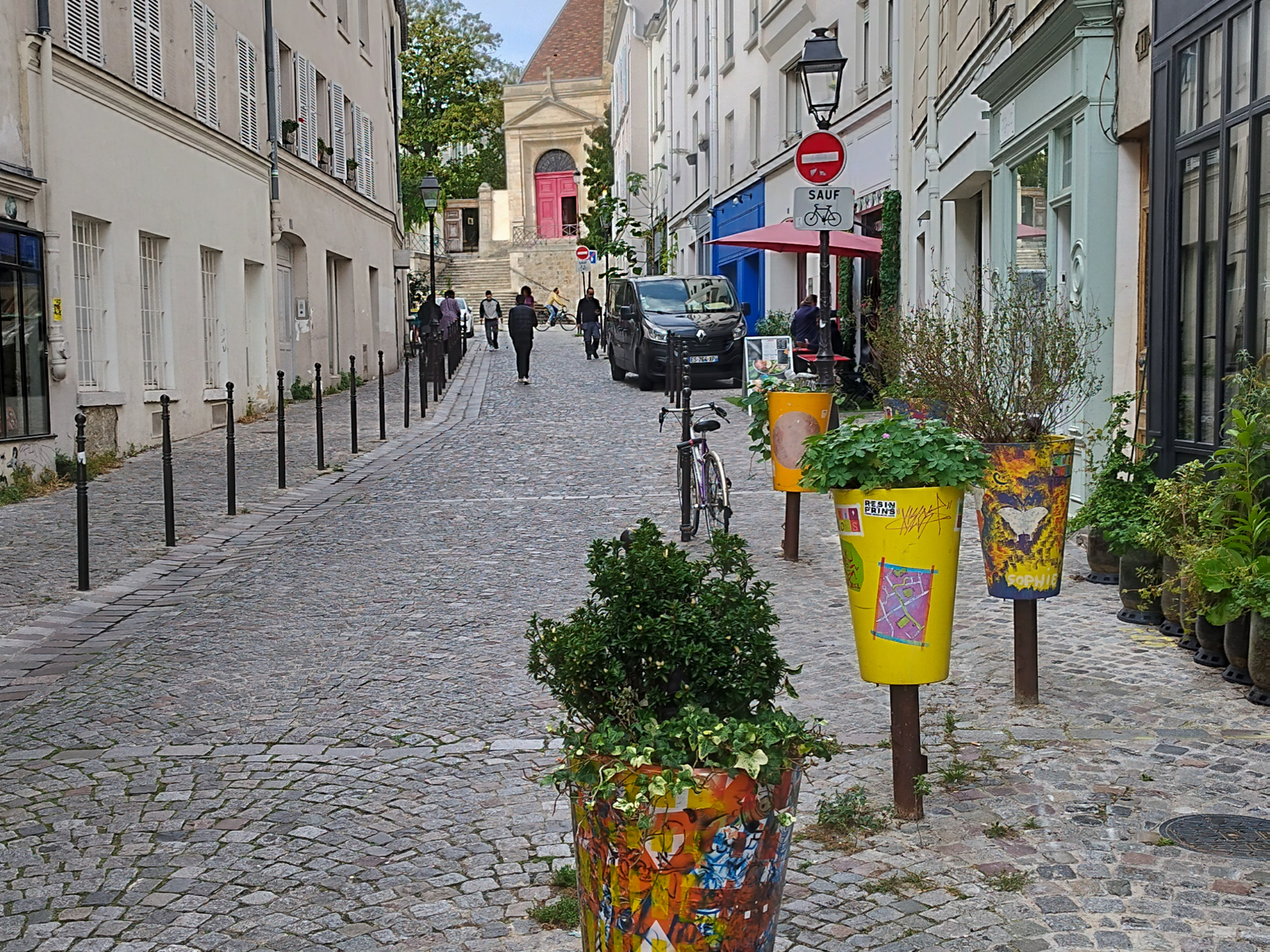 Prendre le passage Plantin à droite. Au bout en face, Cité Antoine Loubeyre. Tourner à droite dans la Rue des Couronnes puis à gauche la Rue Henri Chevreau. Prendre à droite la Rue de la Mare et prendre la Passerelle au dessus de la Petite Ceinture.