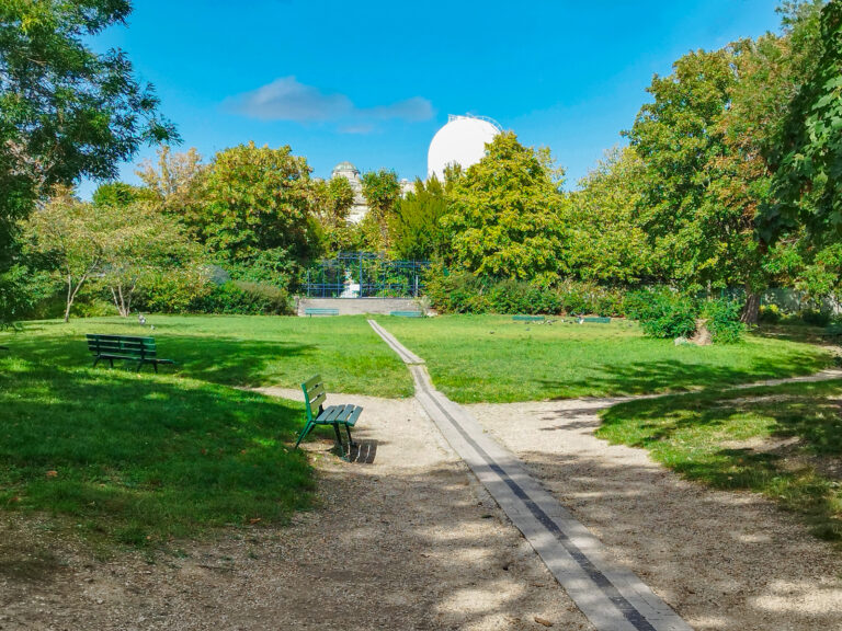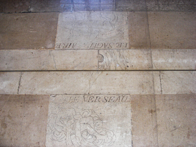 L’Observatoire possède un autre type de mesure du temps. Il s’agit d’une méridienne qui est orientée sur l’axe Nord-Sud et qui indique le passage du soleil au midi vrai. Il en possède 2. L’une d’elle est entouré de gravures des 12 signes du zodiaque. Méridiennes construites pratiquement en même temps que l’observatoire.