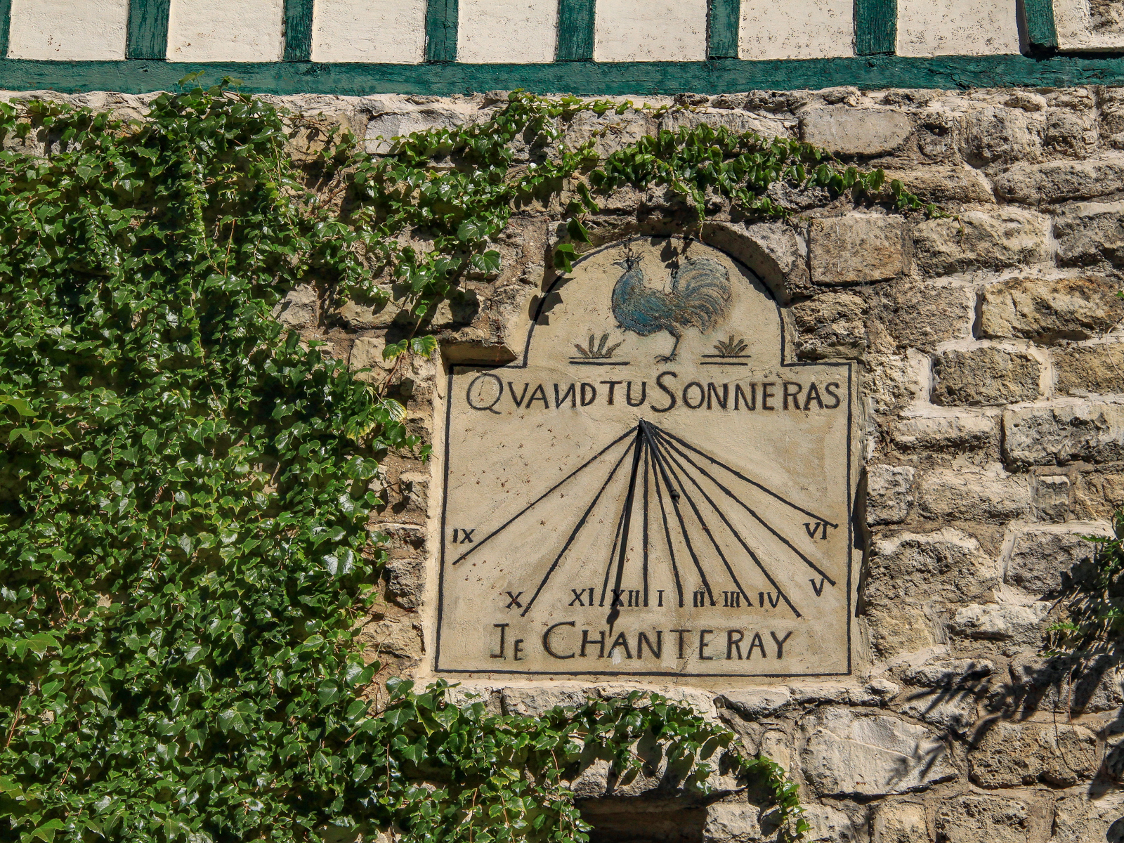Beau cadran solaire sur une maison en bois vert dont les pierres viennent d’édifices de types religieux. Un dicton est inscrit autour du cadran solaire et un coq est sur la partie supérieure du cadran construit en 1924. Cadran légèrement orienté vers l’ouest.