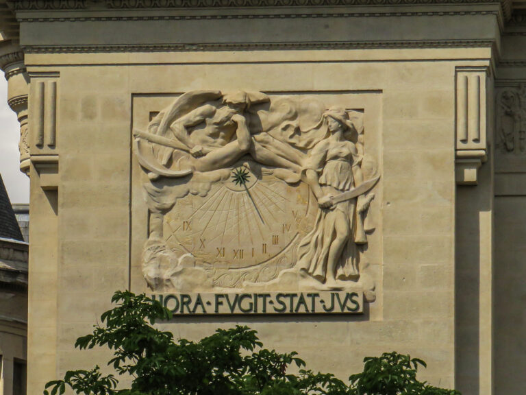 Cadran sur le coté sud du palais de justice. Le palais de justice abritait les rois au 14e siecle. Une horloge coté est fut d’abord installé en 1370 pour éviter l’inexactitude des cadrans solaires. Il fut ensuite décidé en 1900 de mettre un cadran solaire sur la nouvelle aile du palais de justice qui donne sur le quai des orfèvres. Cadran orienté légèrement vers l’ouest.