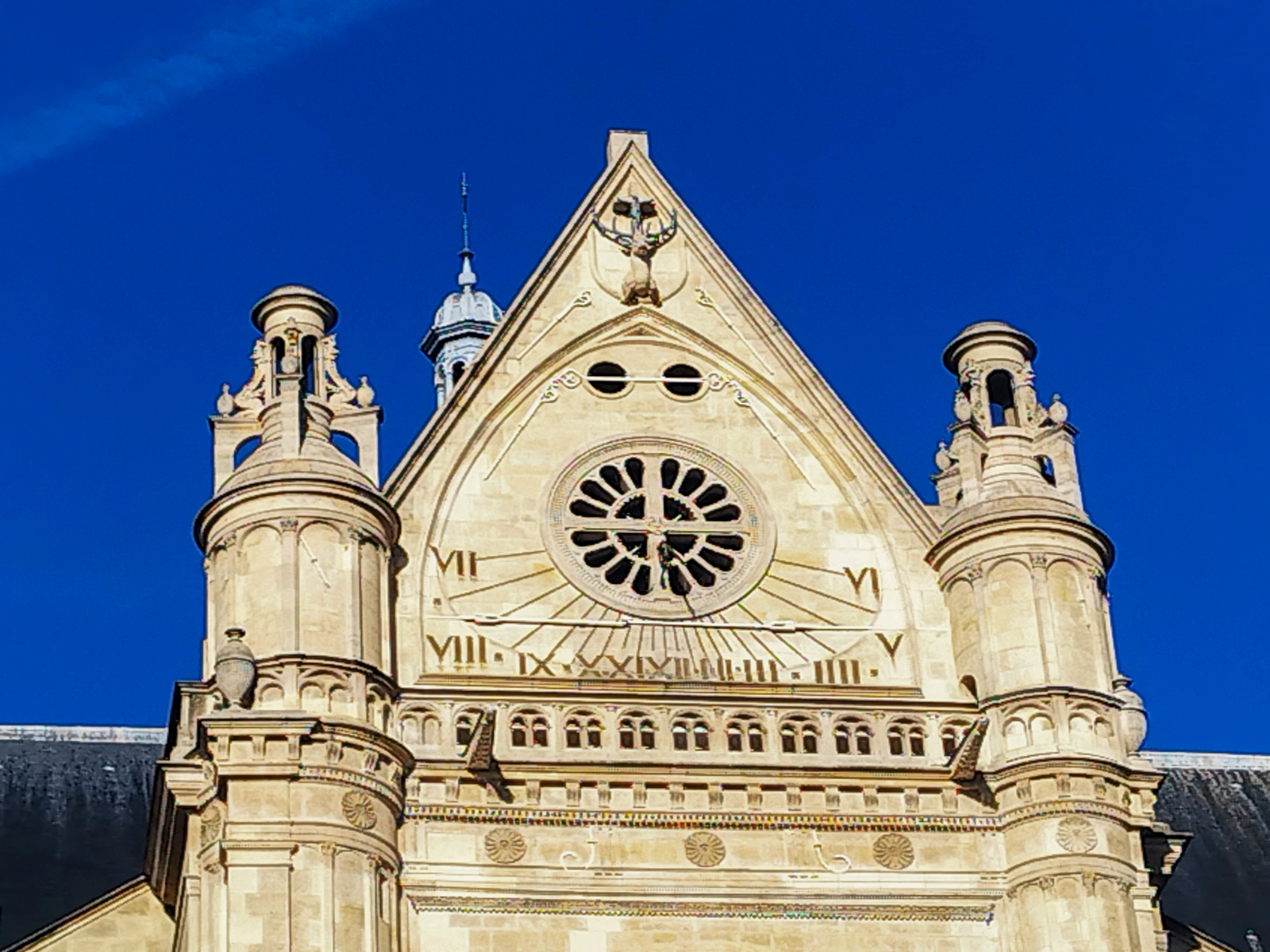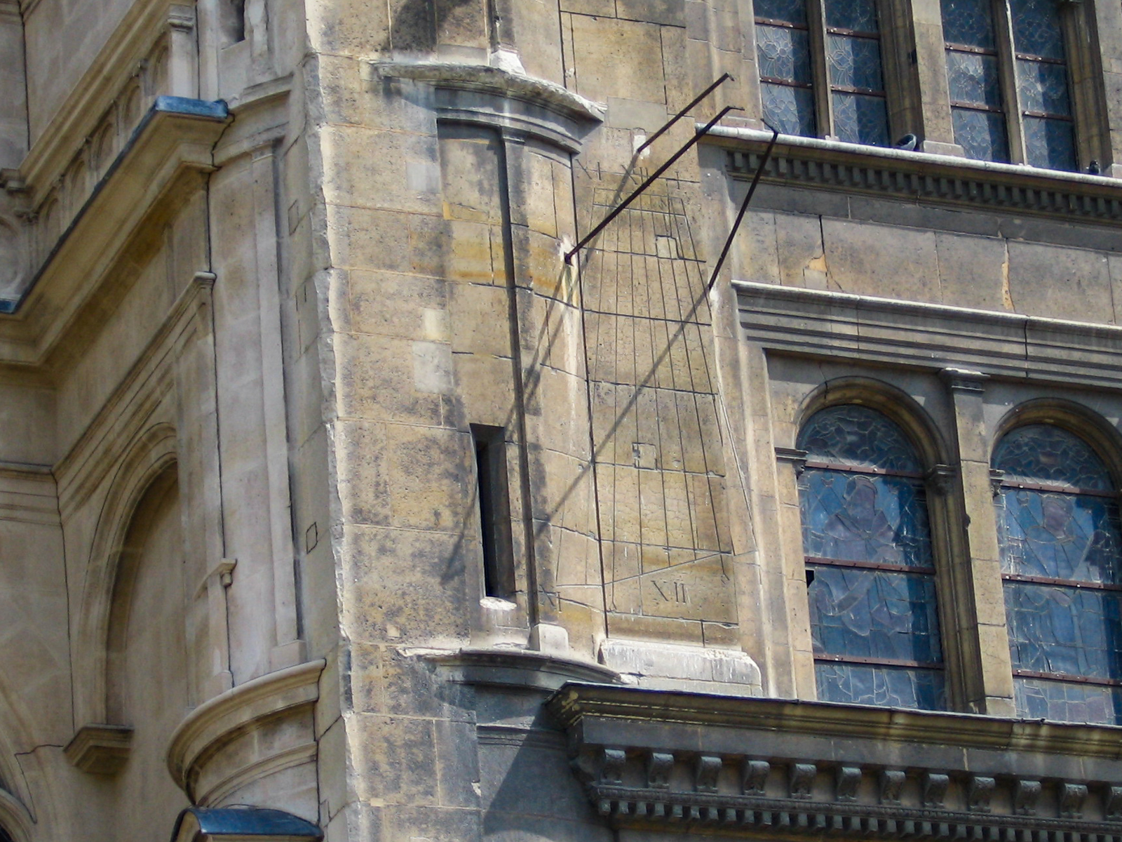 Cadran tout en haut de l’église ste eustache. Il est parfaitement visible depuis le jardin des halles. Une croix et un cerf se trouvent à l’extrémité du cadran. Le cadran possède un repère toutes les demi heures. L’église ste Eustache date de 1532. Cadran orienté légèrement vers l’ouest.
