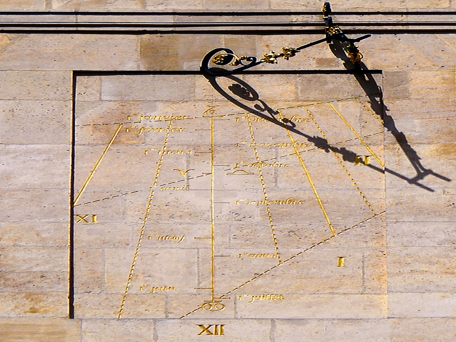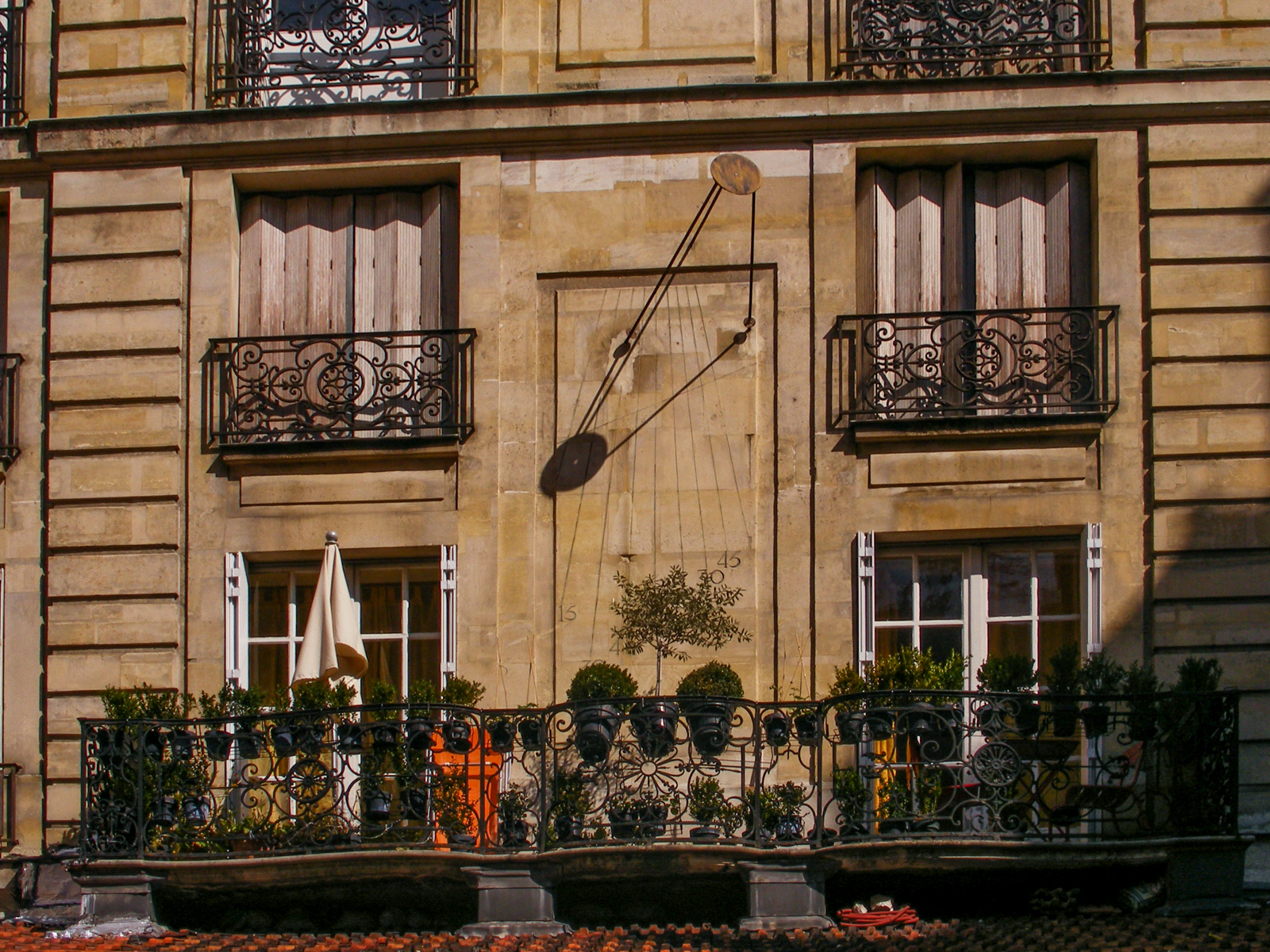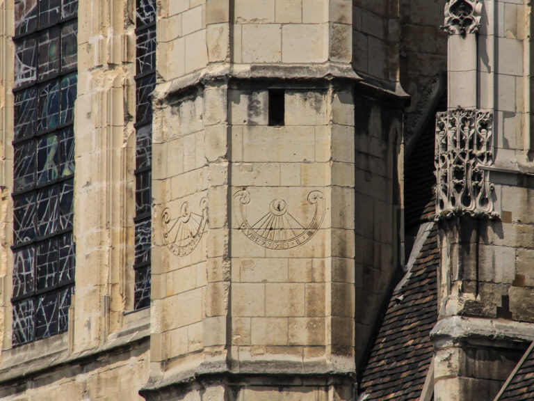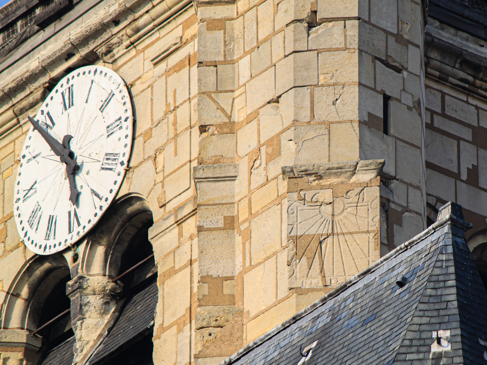 Cadrans jumeaux les plus vieux de Paris. L’église St Gervais St Protais est l’une des plus vieilles de Paris. Un orme sous lequel était rendu la justice se trouve devant l’église. L’église a été commencée à la fin du 15e siècle pour être achevée vers 1650. Un cadran a les heures en chiffres arabes , l’autre en chiffres romains. Cadrans orientés respectivement Sud Ouest et Sud Est.