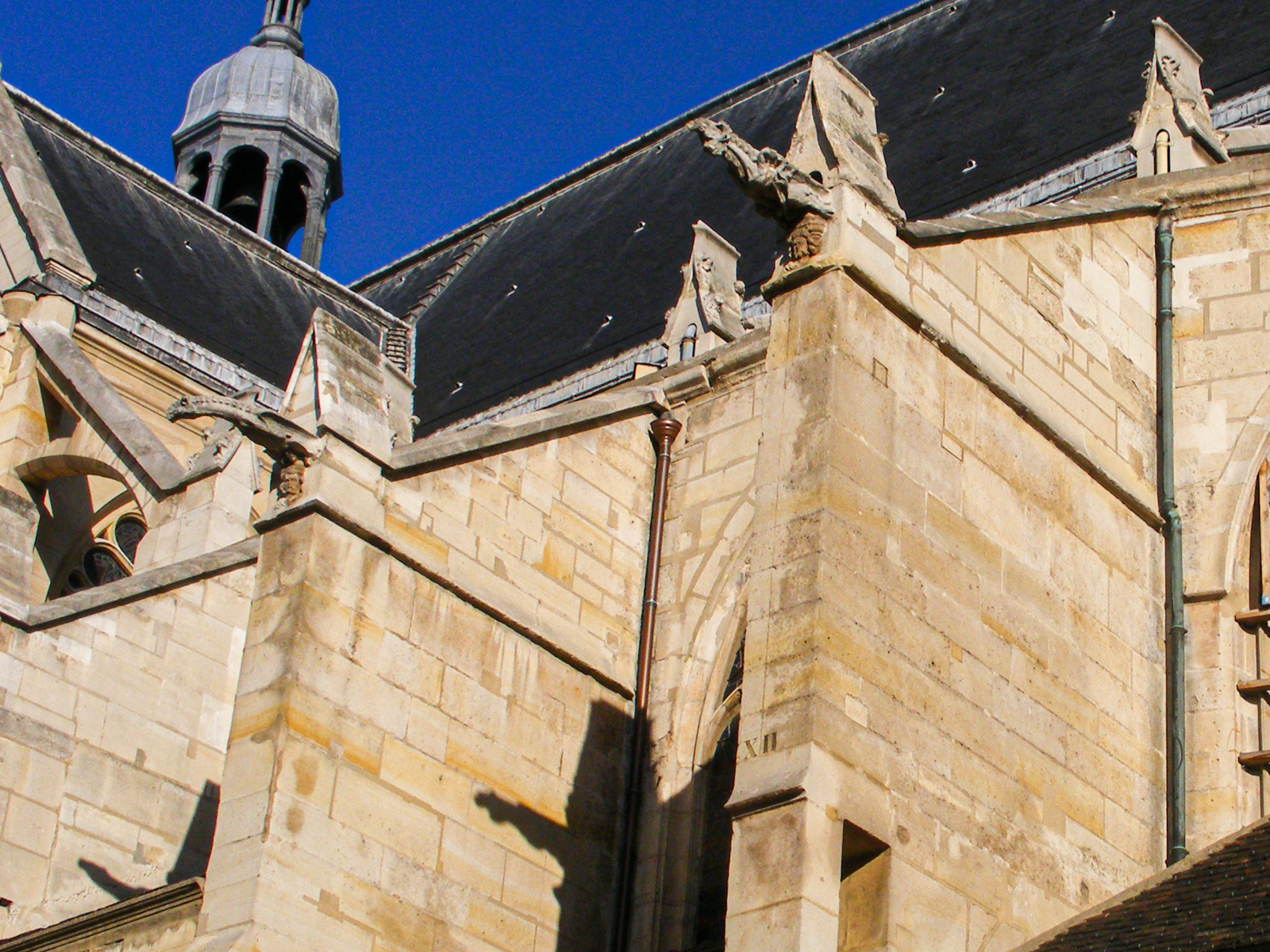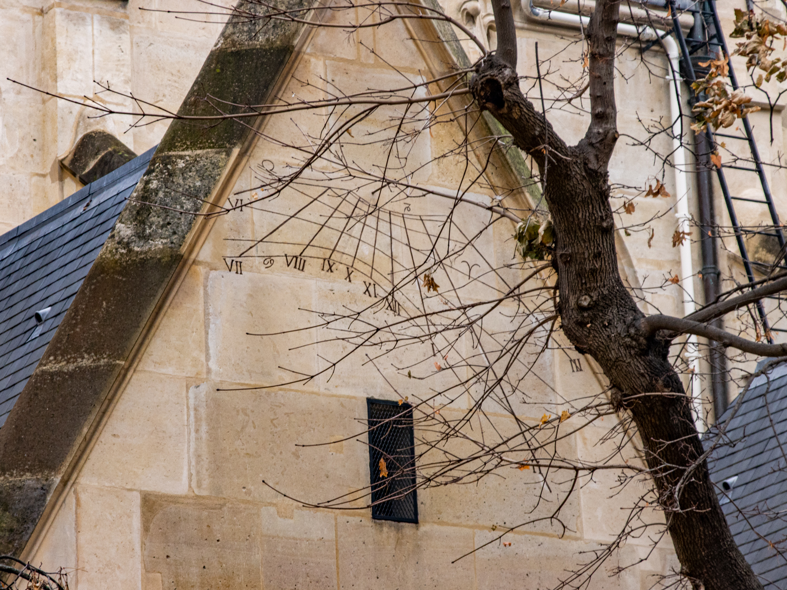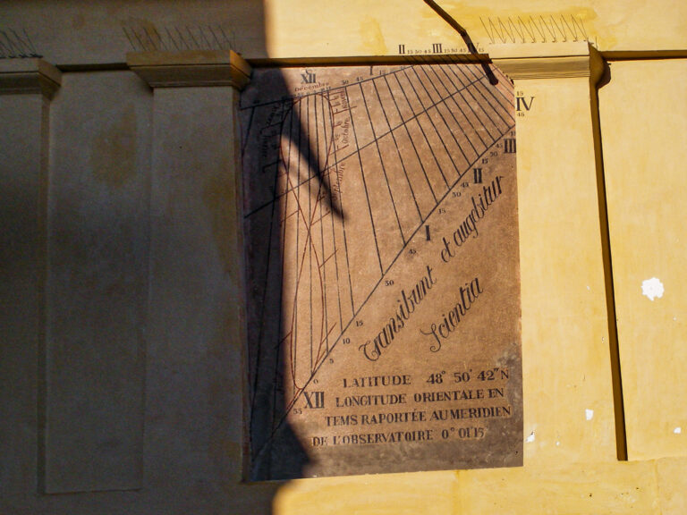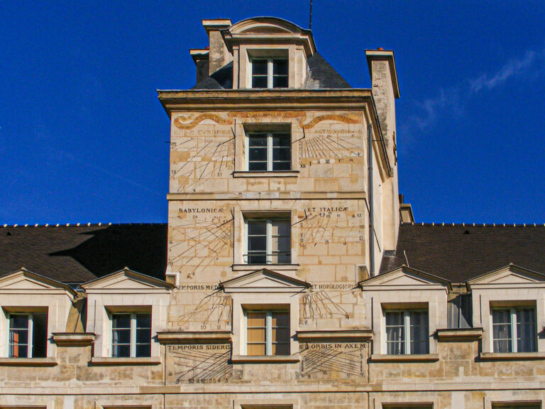 Majestueux cadran solaire dans la cour de la faculté de la Sorbonne. Faculté construit en 1254 par De Sorbon. Une scène au dessus du cadran solaire , montre Phébus dans son char. Les lignes indiquent l’heure pour les demi heures. Le dessin en 8 permet de corriger le temps légal du temps donné par le soleil. Cadran du 17e siecle et récemment rénové, légèrement vers l’ouest.