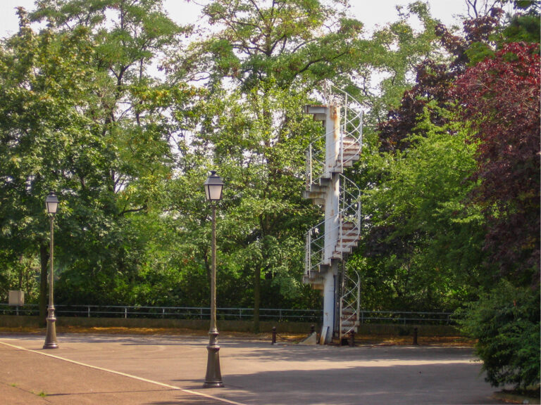 Exposition de 1889. Escaliers du dernier étage de la Tour Eiffel. Il fût démonté et vendu aux enchères en 1983. Un autre morceau est à Levallois.