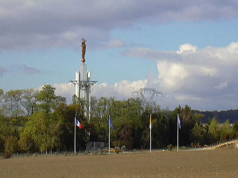 Statue Notre Dame de France situé en pleine campagne dans le pays de France. La vierge porte un enfant dans les bras ouverts sur le monde. Elle fut gardée après la destruction du palais pontifical.